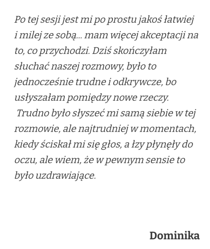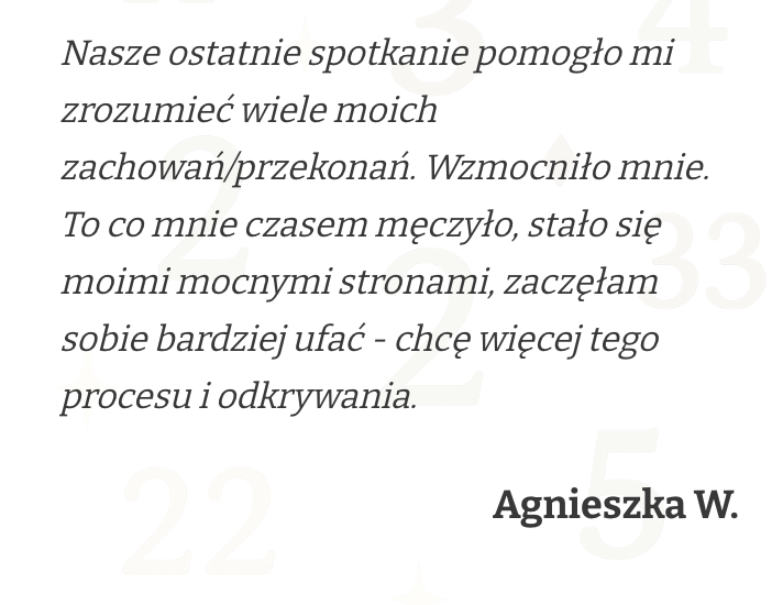 Nasze ostatnie spotkanie pomogło mi zrozumieć wiele moich zachowań/przekonań. Wzmocniło mnie. To co mnie czasem męczyło, stało się moimi mocnymi stronami, zaczęłam sobie bardziej ufać - chcę więcej tego procesu i odkrywania.